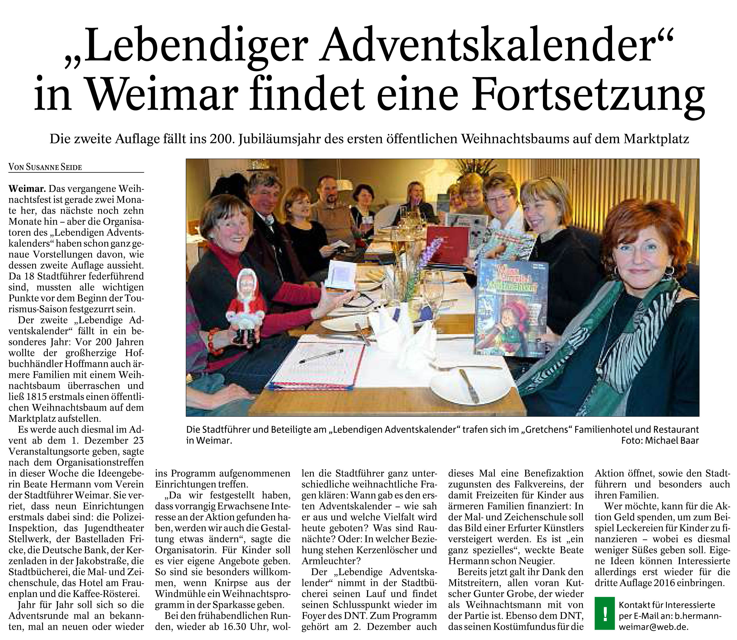 Quelle: Susanne Seide: „Lebendiger Adventskalender" in Weimar findet eine Fortsetzung. In Thüringer Allgemeine Weimar. 26. Februar 2015, TAWE3.
